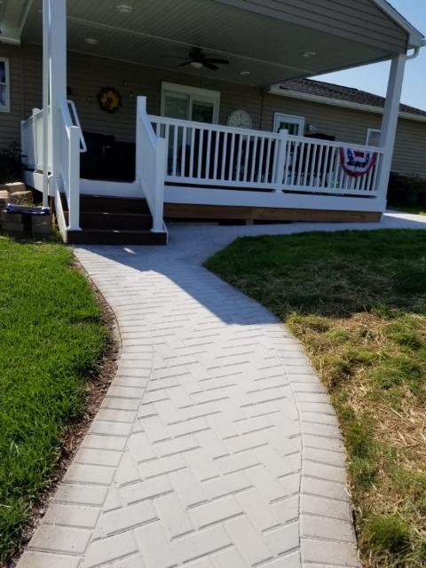 The other portion of the project was a walkway and patio area. The brick paver walk that we installed was mainly to connect the pool area to the new deck that was just installed. The new deck had steps leading down closer to the pool area than the deck that it replaced. Since the steps were in a different location it left a concrete walk leading to part of the deck where there was just railing.