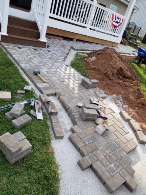 As with many of our jobs, since the client liked how the retaining wall and walk were being done they asked us about adding a brick paver patio to the project. We gave them a price on the change order and after they signed we ordered additional material for the patio.