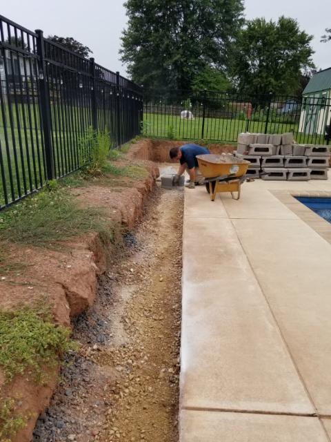 This particular retaining wall failed due to drainage issues. We were surprised that we found a drainage pipe at the base of the retaining wall as we were removing it, since usually having a pipe there eliminates the hydrostatic pressure of water behind the wall giving a way for the water to drain away. The problem did indeed lie with the drainage pipe. Even though a drainage pipe was behind the wall, at some point someone cut and buried the end of the pipe where it drained when they installed a concrete walk to the pool area. This started the process of the retaining wall failure.